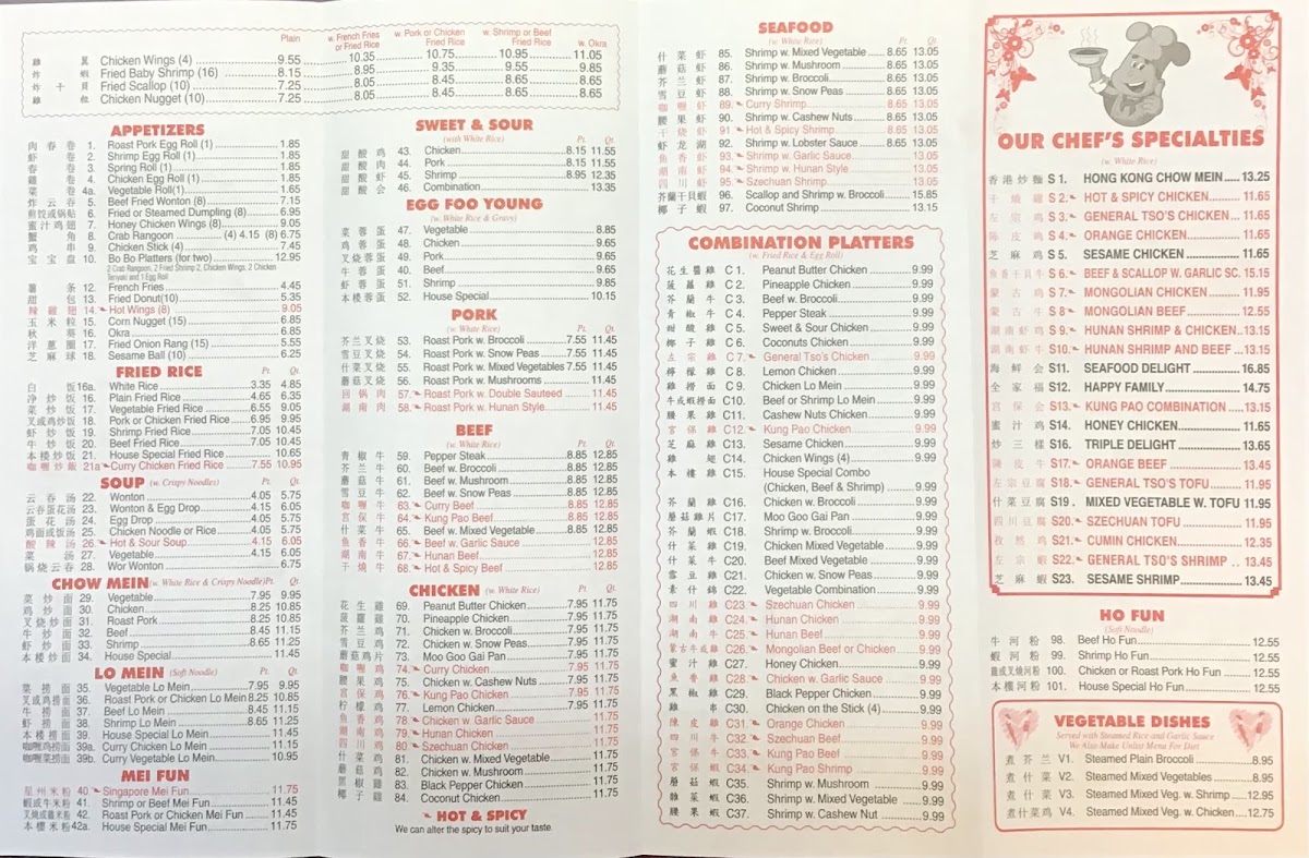 Includes two roast pork egg roll. two crab rangoon, General Tso's chicken, house special lo mein (quart), one bottle soda.