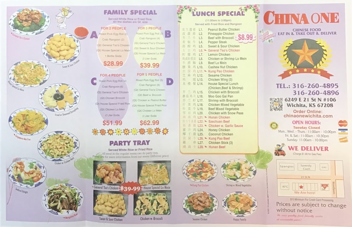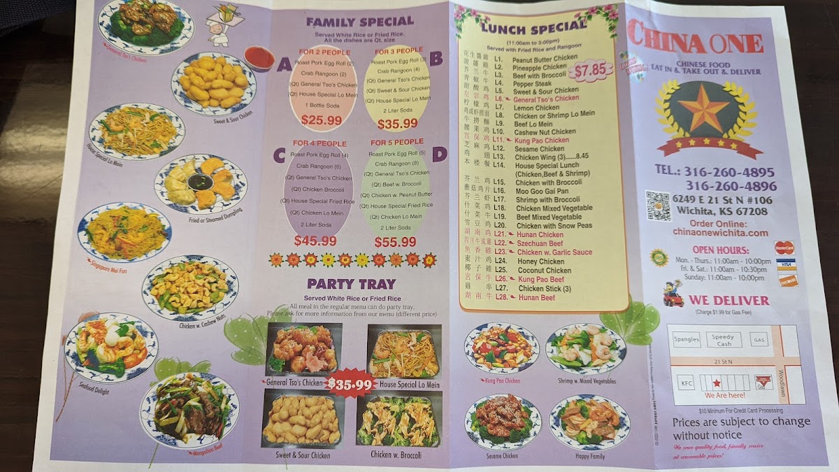 Welcome to China One (New China King), your go-to spot for authentic Chinese cuisine in Wichita, KS. Their menu boasts a delightful range of dishes that cater to all palates, from classic favorites to chef's specialties. Start with the General Tso's Chicken, a hot and spicy highlight that promises a satisfying crunch. For a unique twist, indulge in the Triple Delight, featuring beef, chicken, and shrimp in a savory brown sauce.
